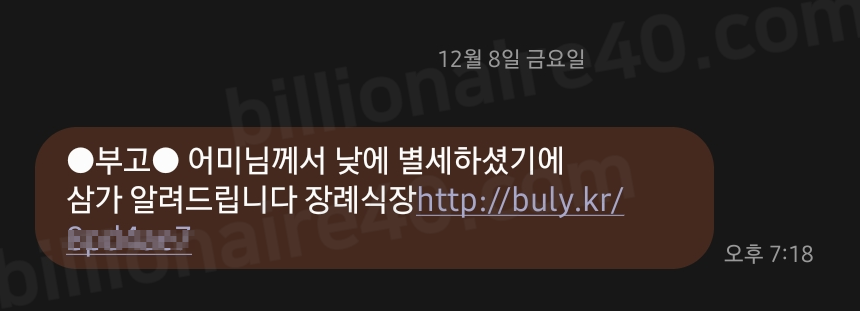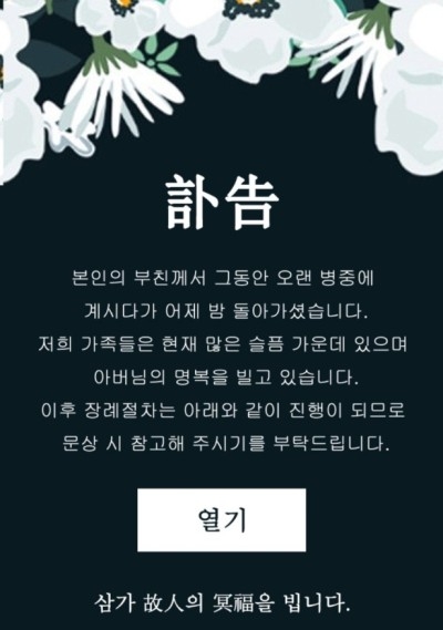 메시지 상의 링크 클릭 시 아래와 같은 부고장 형태의 웹페이지가 열리는데요. 보시면 아시겠지만, SMS 상에 어머님 별세로 되어있던 내용이 부고장에서는 부친상으로 바뀌어 있는 등 다소 허술한 모습이 보입니다.