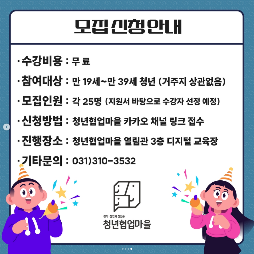 청년협업마을? 무슨 기관이길래 무료 강의를 하는걸까? 싶으시죠? (저도 똑같은 생각을 했답니다. 😅) 청년협업마을은 시흥시에서 운영하는 기관으로, 청년들의 다양한 창업·창작 활동을 실험하고, 이를 지원하는 공간이라고 합니다. 청년들이 이곳에서 협업으로 자립해 나갈 수 있도록 성장단계에 적합한 공간 및 교육 프로그램을 제공한다고 하는데요. 청년들의 창업을 지원하는 기관이기에 감사하게도 이런 귀한 강의를 무료로 제공할 수 있구나, 싶습니다. 청년협업공간은 창업 지원 기관 답게 공간 제공도 하고 다양한 프로그램을 운영하고 있는데, 아래 인스타그램 게시물을 통해 청년협업공간이 어떤 곳인지 확인하실 수 있습니다.