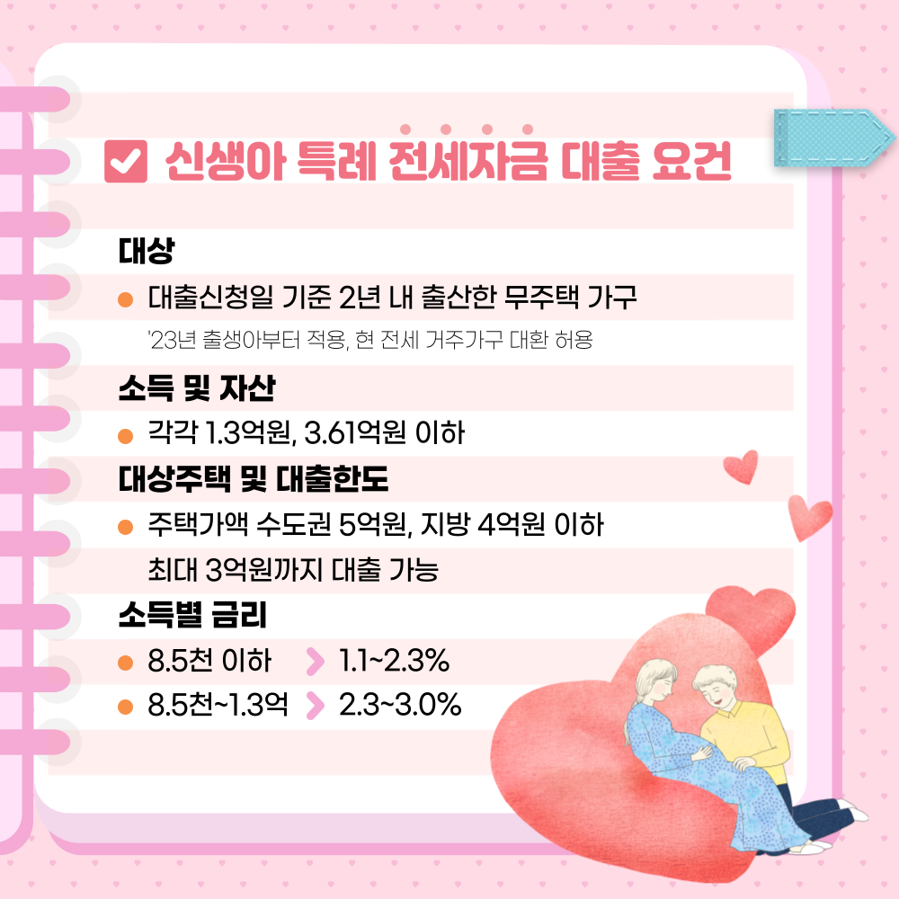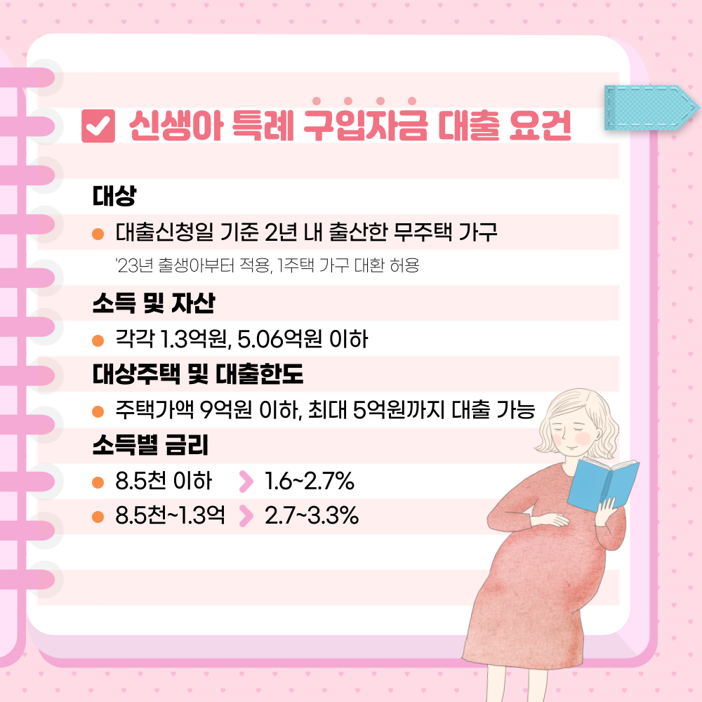 대상은 대출신청일 기준 2년 내 출산한 무주택 가구입니다. 주목할 점은 신청일자를 기준으로 전후의 제약이 없다는 것인데요. 달리 말하면 원칙상 현재 임신 중이거나, 심지어 전이어도 된다는 의미이기 때문입니다.