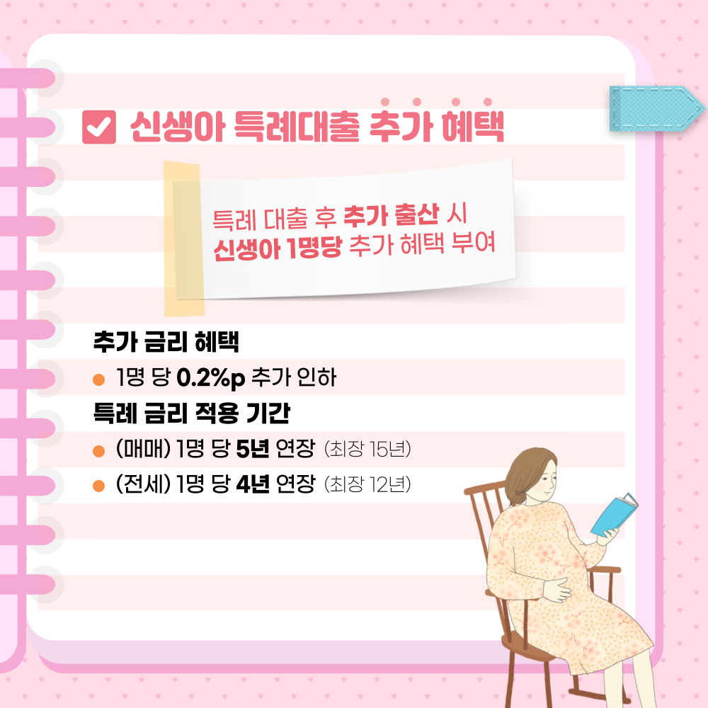 대출 실행 후 1명을 추가로 낳을 때 마다 금리는 0.2%p 인하되고, 특례 적용 기간은 매매가 5년, 전세가 4년이 연장되는데요. 최장 15년(전세 12년)까지 혜택을 볼 수 있으니 출산을 계획하고 있는 예비 혹은 신혼 부부들의 관심이 커질만 한 것 같습니다.